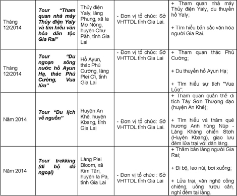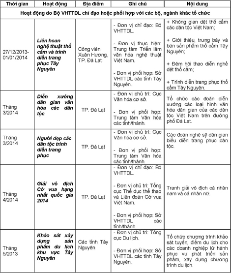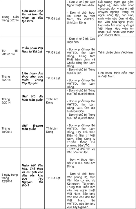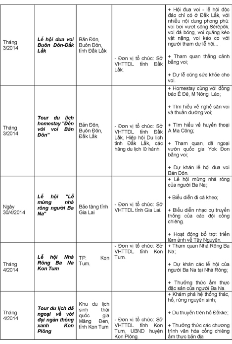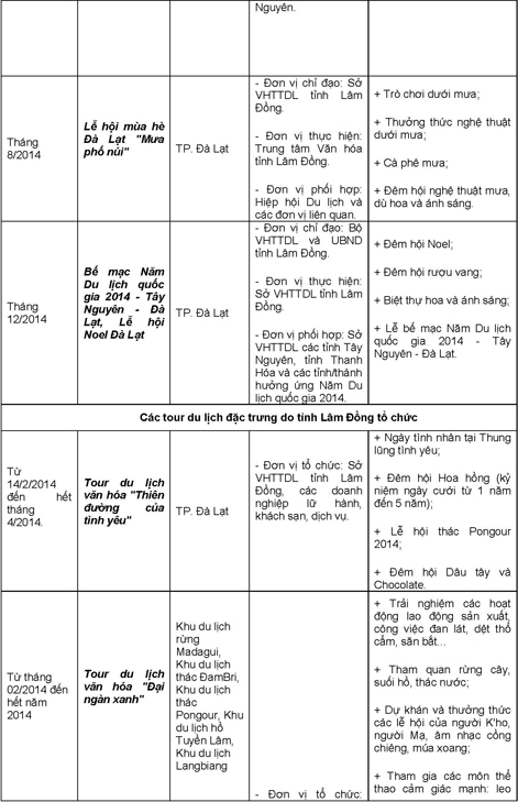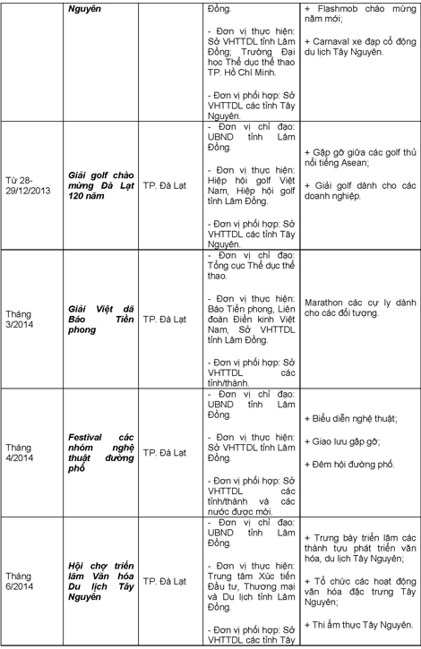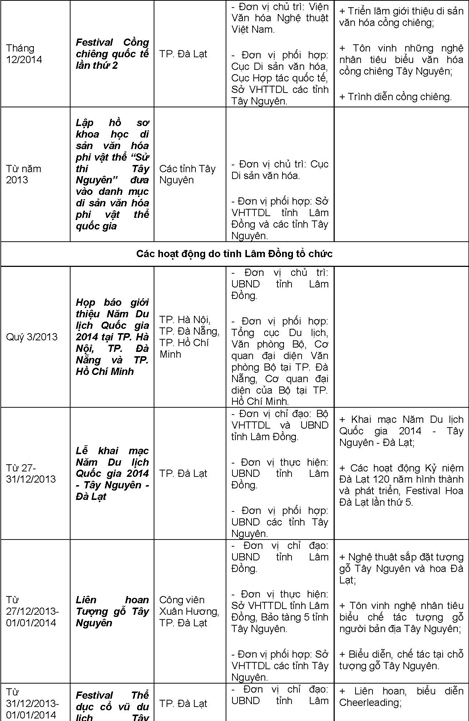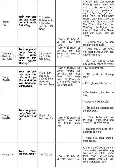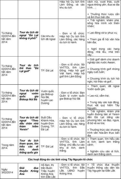 Các hoạt động trong khuôn khổ Năm Du lịch Quốc gia 2014 diễn ra trong suốt cả năm, trong đó tập trung cao điểm vào các tháng đầu năm, tháng 6,7 và những tháng cuối năm trên địa bàn tỉnh Lâm Đồng và 4 tỉnh Tây Nguyên (Đắk Lắk, Đắk Nông, Gia Lai, Kon Tum).